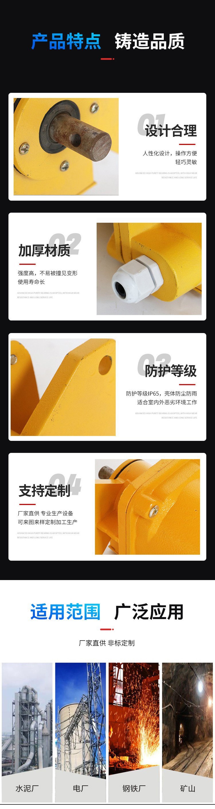 iqi廣州南創電子科技有限公司應用場景和安裝方式iqi廣州南創電子科技有限公司賽摩PLR2300測速傳感器廣泛應用于皮帶秤系統中,通過連接在專用的測速滾筒上,可以消除摩擦輪與皮帶間因打滑所產生的誤差。其鑄鋁外殼具有良好的屏蔽性和封閉性能,適用于戶外安裝,且無需調整、校準和維護。