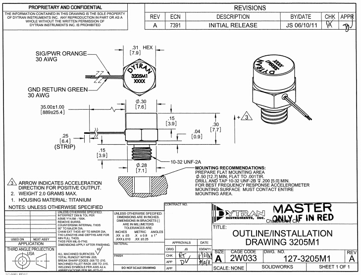 美國Dytran3205M1加速度傳感器尺寸圖: