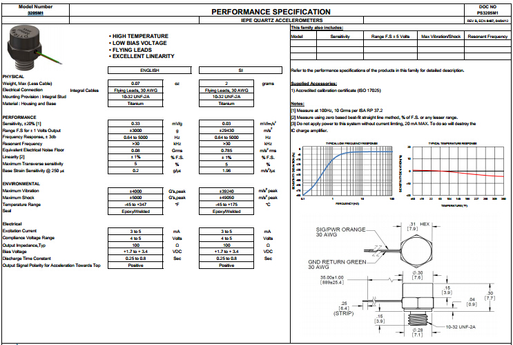 美國Dytran3205M1加速度傳感器的性能規格參考圖: