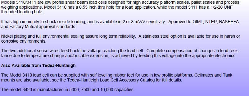 Tedea特迪亞亨特利3410-4000lbs稱重傳感器應用:美國Tedea 3410傳感器適合于低平面平臺,托盤車稱重,車輛和筒倉稱重采用不銹鋼材料3410-4000lbs稱重傳感器設計,3410-4000lbs傳感器防護等級IP67。