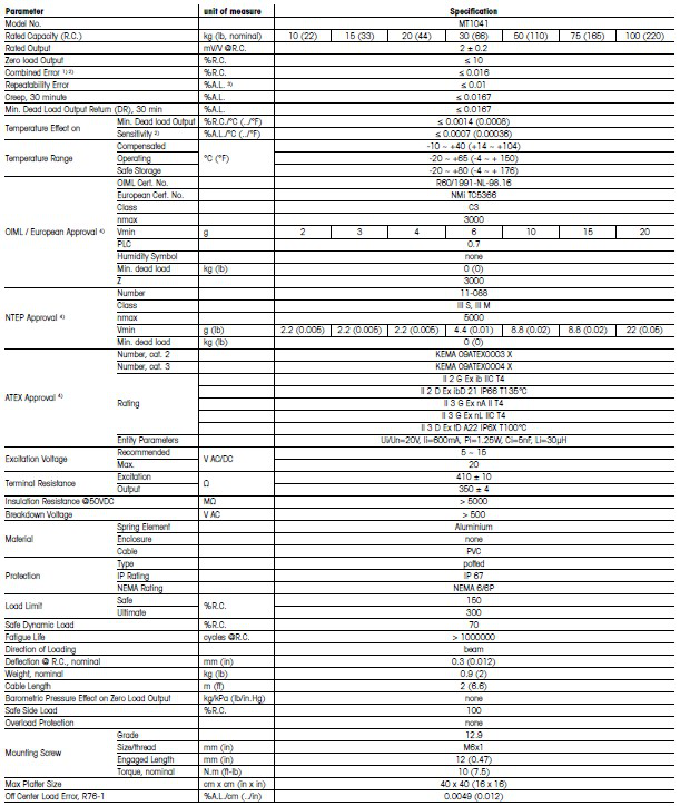 Mettler Toledo MT1041-100kg稱重傳感器主要特性:
