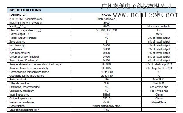 美國celtron稱重傳感器MBB-250kg 技術參數:8yq廣州南創電子科技有限公司