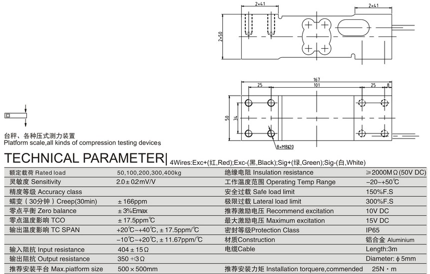 應用場合:臺秤、各種壓式測力裝置 推薦安裝臺面 400*500mm (50-350kg);500*600mm(500-800kg)