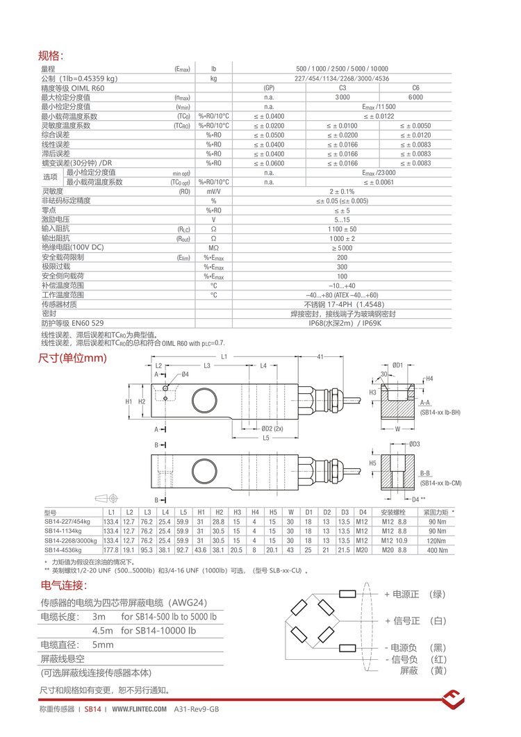 德國Flintec稱重傳感器SB14-454kg產品技術參數:ez7廣州南創電子科技有限公司