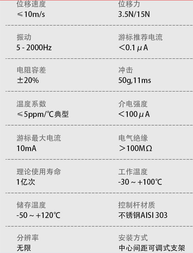 BaN廣州南創(chuàng)電子科技有限公司LTC-M-0450-S-XL0396 LTC-M-0475-S-XL0396拉桿式直線位移傳感器杰佛倫相關特點:BaN廣州南創(chuàng)電子科技有限公司杰佛倫gefran拉桿式直線位移傳感器(別名:杰佛倫電子尺,杰佛倫電阻尺,杰佛倫電位器,杰佛倫位移傳感器)原理:電位計原理,傳感器保證在所有條件下的高可靠性,機械結構使LTC適合應用在強烈振動的情況中,超出理論電氣行程后無電氣信號輸出變化安裝更簡單。輸出直流電壓信號,也可以通過內置或者外置的變送模塊講信號轉換成標準的0-5V、0-10V或者4-20mA直流信號,也可以遠距離傳輸控制要求。杰佛倫gefran位移傳感器廣泛應用于注塑機,立式注塑機和其他許多生產設備。