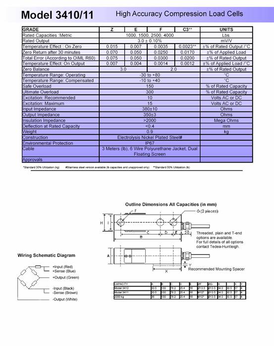 美國TEDEA-HUNTLEIGH 3410-2500LB稱重傳感器技術參數圖: