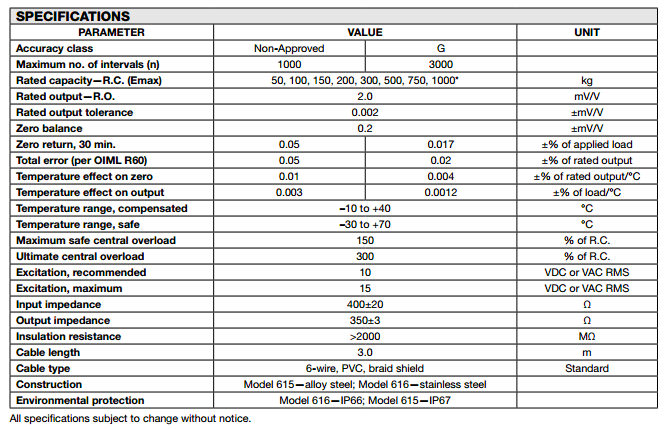 美國特迪亞tedea 615稱重傳感器系列所有量程如下:xkY廣州南創電子科技有限公司