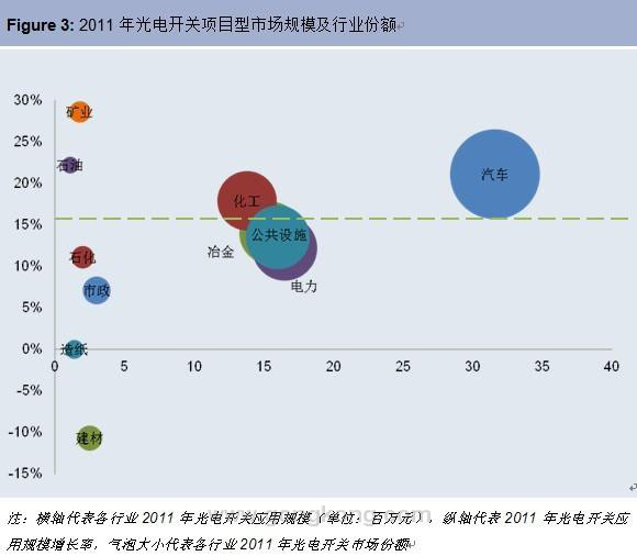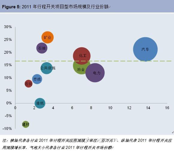 除建材行業接近開關、光電開關和行程開關的市場需求分別同比下滑11%、12%和8%之外,項目型市場其他行業領域的傳感器應用均有不同程度的增長,其中、汽車、礦業和石油行業的增長超過20%。