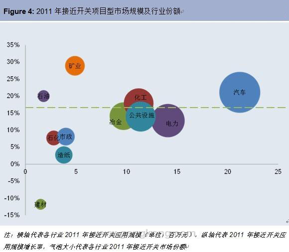 2011年,項目市場接近開關銷售額為1.22億元,同比增長16.2%,高于2010年的14.8%。汽車、電力和冶金三大行業的銷售額分別為2120萬元、1410萬元和970萬元,分別占比17.4%、11.6%和8.0%。ND0廣州南創電子科技有限公司