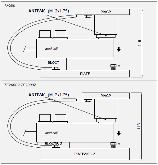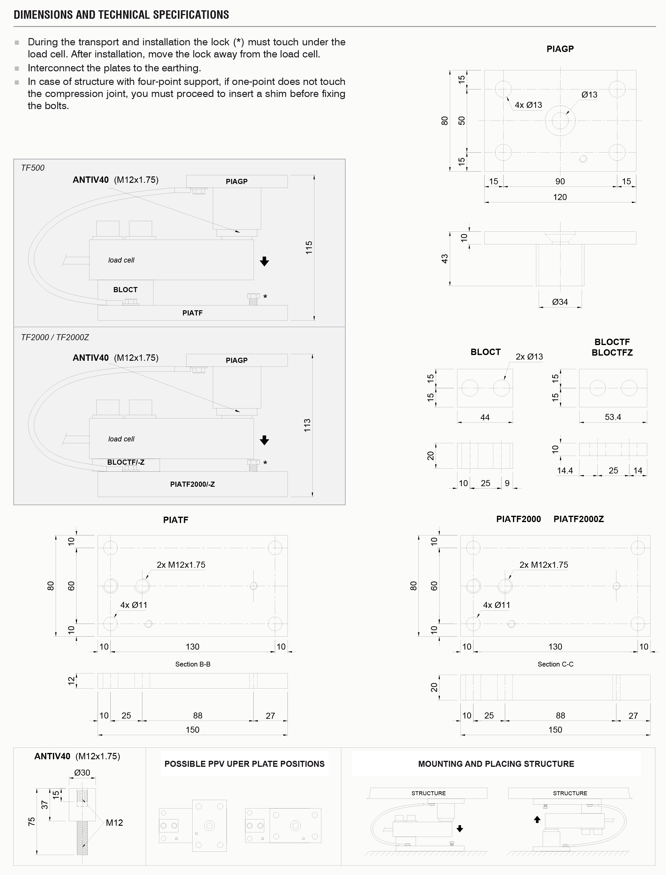 Mounting kits constructed of AISI 304 stainless steel (*2000Z : version with PIATF2000Z and BLOCTFZ constructed of galvanized steel); designed for tanks, hoppers, platforms, etc..; provided with a compression joint in AISI 304 stainless steel and rubber, to compensate for misalignment of the support plates. Max static load 500/2000 kg.