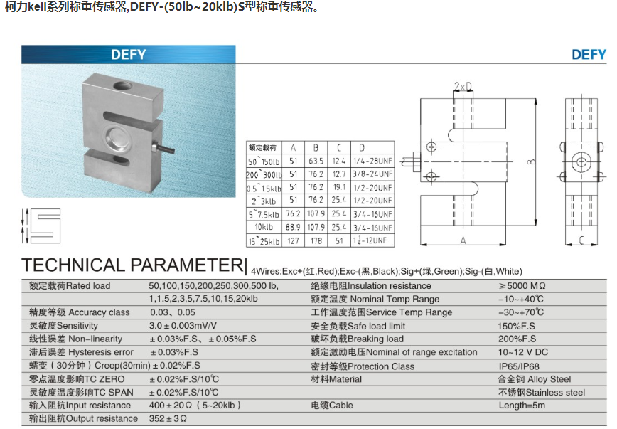 量程可選:DEFY型稱重傳感器250lb/100lb/150lb/200lb/250lb/300lb/500lb/1klb/1.5klb/2klb/3klb/5klb/7.5klb/10klb/15klb/20klb VPx廣州南創電子科技有限公司