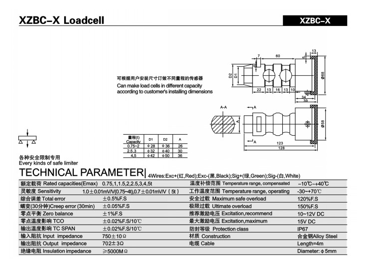 w7p廣州南創電子科技有限公司 w7p廣州南創電子科技有限公司寧波柯力稱重傳感器XZBC-X-0.75t產品技術參數及尺寸圖:w7p廣州南創電子科技有限公司