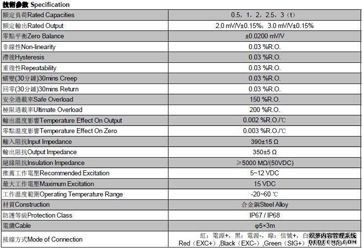 額定輸出Rated Output 2.0 mV/V±0.15%;3.0 mV/V±0.15%