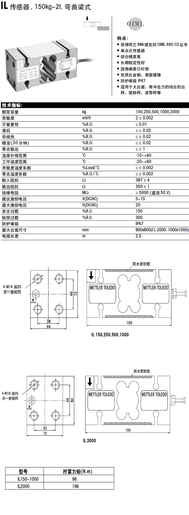 托利多IL稱重傳感器技術指標: