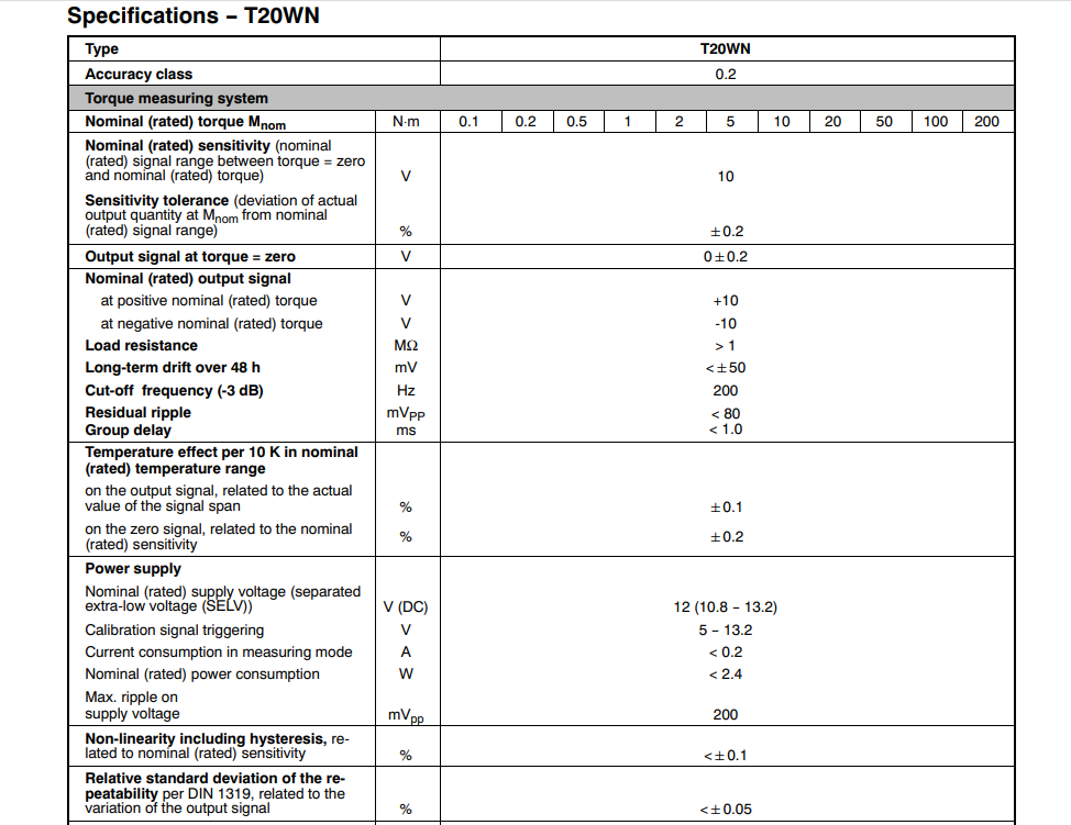 德國HBM T20WN扭矩傳感器技術(shù)參數(shù):