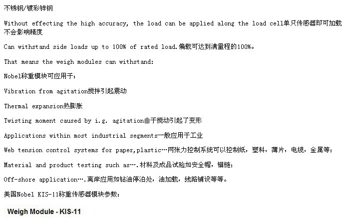 美國Vishay Nobel稱重模KIS-11塊高精度,高安全稱重傳感器配合安裝模塊穩定性好,含有壓電薄膜,備用有一般非防爆型及防爆型規格供選購,動態加載模塊的安裝:四動態加載模塊的安裝,一般三面有限的兩個模塊,其他兩個模塊只在最后期限。RTc廣州南創電子科技有限公司