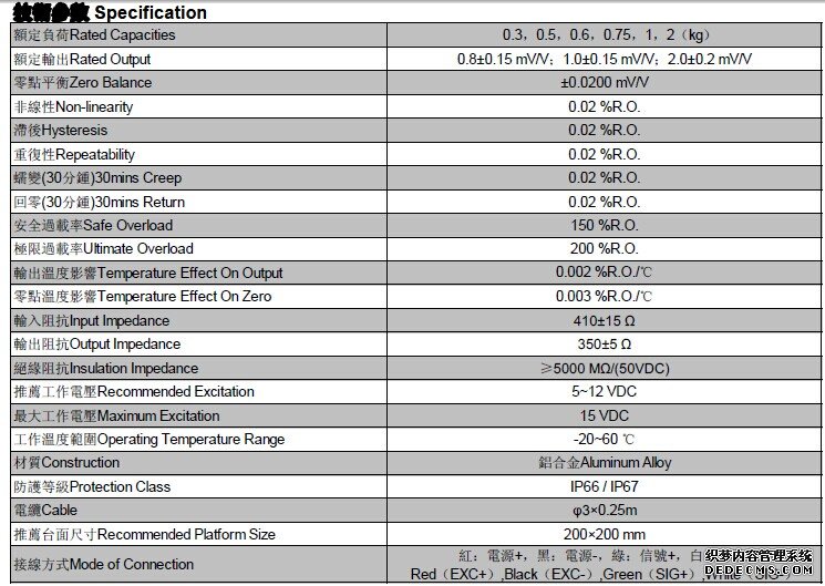 臺灣Mavin稱重傳感器NA12-0.5kg技術參數:AfT廣州南創電子科技有限公司