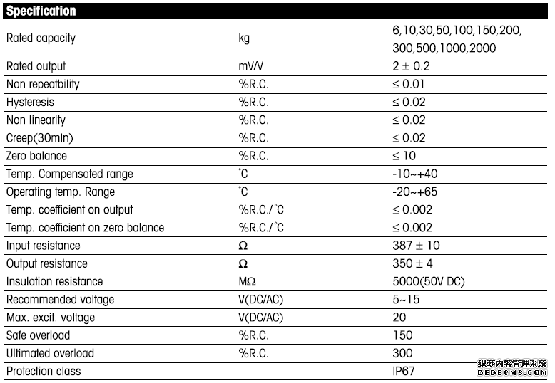 適用于干燥環境中,主要用于臺秤、包裝秤、皮帶秤、檢重秤和過程控制的場合。傳感器容量有6,10,30,50,100,150,200,300,500,1000,2000kg