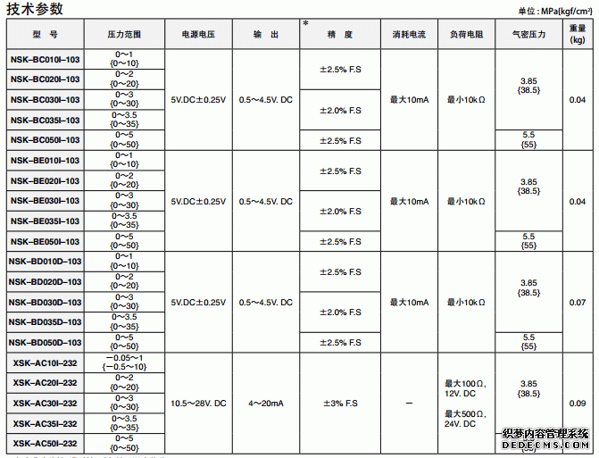日本鷺宮NSK型壓力傳感器產品技術參數圖:njp廣州南創電子科技有限公司