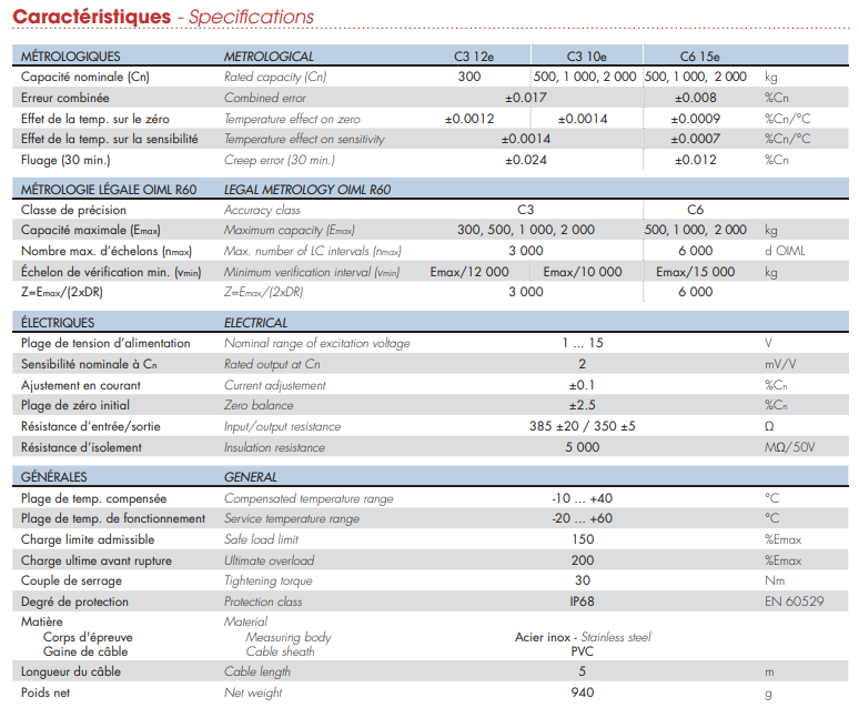 法國世感Scaime稱重傳感器產品參數圖:gqC廣州南創電子科技有限公司
