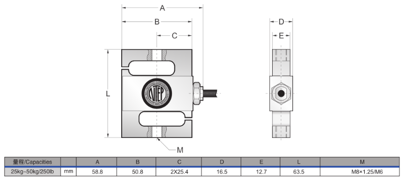 yK3廣州南創電子科技有限公司美國傳力Transcell稱重傳感器BA-50kg尺寸圖:yK3廣州南創電子科技有限公司