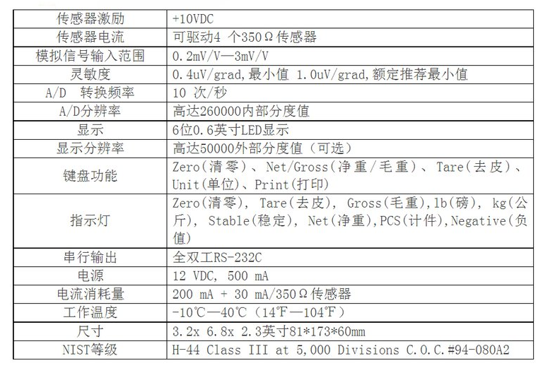 美國傳力稱重顯示儀表TI-500E的技術參數具體介紹:TI-500E稱重儀表Transcell傳感器激勵:+10VDC傳感器電流:可驅動4個350Q傳感器模擬信號輸入0圍:0.2mV/V---3mV/V靈敏度:0.4uV/grad,最小值1.0uV/grad,額定推薦最小值A/D轉換頻率:10次/秒A/D分辨率:高達260000內部分度值顯示:6位0.6英寸LED顯示顯示分辨率:高達50000外部分度值(可選)鍵盤功能:Zero(清零)、Net/Gross(凈重/毛重)、TI-500E儀表Tare(去皮)、Unit(單位)、Print(打印)指示燈:Zero(清零),Tare(去皮),Gross(毛重),Ib(磅),kg(公斤),Stable(穩定),Net(凈重),PCS(計件),Negative(負值)串行輸出:全雙工RS-232C電源:12VDC,500mA電流消耗量:200mA+30mA/350Q美國傳力稱重顯示儀表TI-500E傳感器工作溫度:-10℃---40℃(14°F---104F)尺寸:3.2"×6.8”×2.3”NIST等級:H-44 Class III at 5,000Divisions C.O.C.#94-080A2保修:1年保修。Qnr廣州南創電子科技有限公司