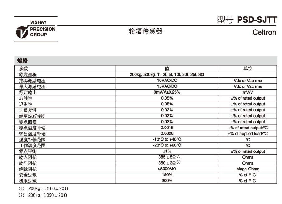vishay celtron PSD-500kgSJTT稱重傳感器型號類別技術(shù)參數(shù)選型安裝等資料信息,如果有關(guān)
