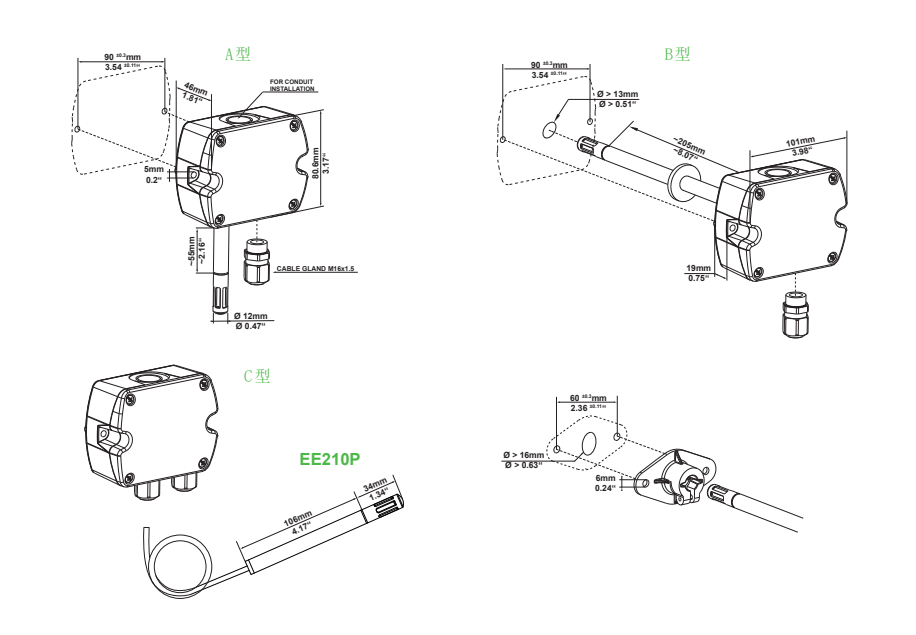 奧地利E+E ee210溫濕度探頭安裝尺寸圖:Ybo廣州南創電子科技有限公司